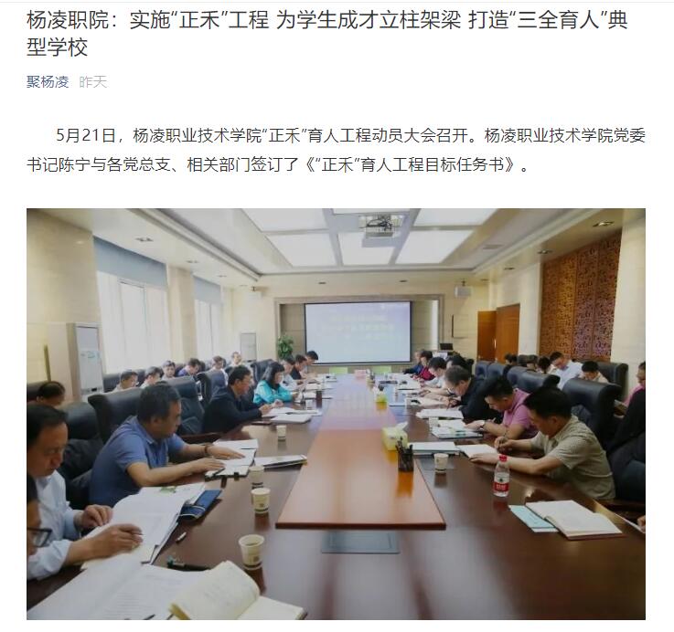 5月21日,杨凌职业技术学院“正禾”育人工程动员大会召开。杨凌职业技术学院党委书记陈宁与各党总支、相关部门签订了《“正禾”育人工程目标任务书》。
