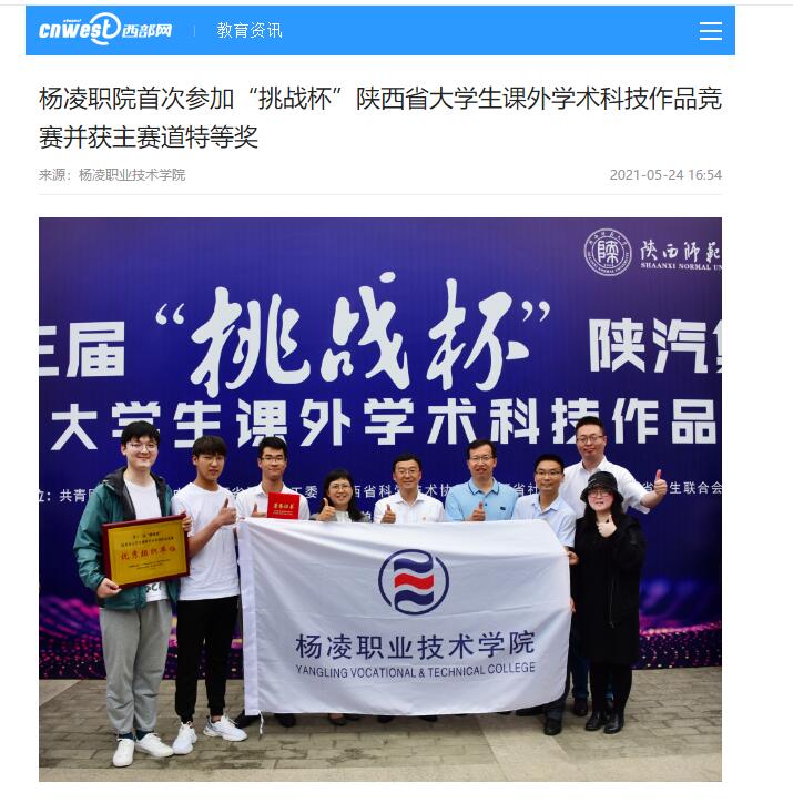5月22日,由团省委、省委教育工委、省科协、省社会科学院、省学联共同主办的第十三届“挑战杯”陕西省大学生课外学术科技作品竞赛在陕西师范大学举行。杨凌职业技术学院荣获主赛道特等奖1项,是主赛道唯一获特等奖的高职院校,本次特等奖项目直接晋级国赛。同时,杨凌职院还荣获二等奖4项,三等奖3项,学校被授予“优秀组织奖”。杨凌职院党委书记陈宁带队参加了闭幕式暨颁奖仪式。