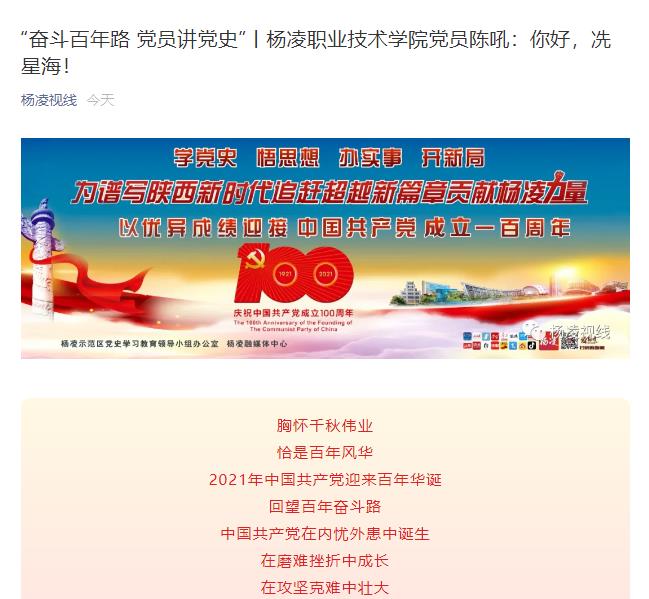 为庆祝中国共产党成立100周年,杨凌示范区党工委组织部、杨凌示范区党工委宣传部、杨凌融媒体中心联合推出——“奋斗百年路 党员讲党史”微视频大赛。杨凌融媒体中心推出专题栏目,对优秀视频进行展播,通过讲述红色故事,展示中国共产党领导人民进行革命斗争、改革开放、实现中华民族伟大复兴的光辉篇章。