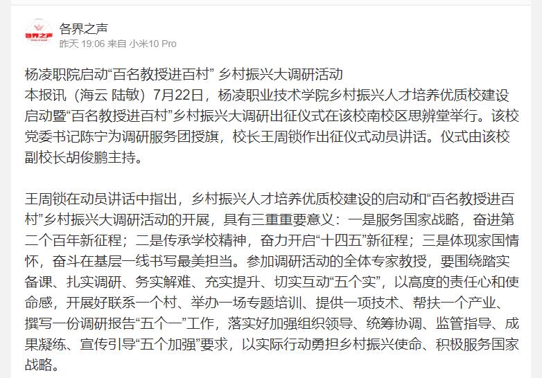 “百名教授进百村”活动是杨凌职院依托学校省级科技特派员、产业体系专家、“博士+高职生工作室” 、“教授+科研推广工作室”、产学研示范基地、精准扶贫结对帮扶点等载体,在全校遴选了300 名思想素质好、理论水平高、实践经验丰和责任心强的专家教授,组成110个服务团,自即日起至8月31日,深入陕西省12个市(区)的100个县村,根据当地产业发展需要开展的一项“支农助农”活动。该活动融党史宣讲、政策解读、社会服务、技术指导为一体,通过开展党史宣传讲座、专题化“百村论坛”、现代农业技术推广、乡村治理咨询及乡村发展现状研究等活动,搭建服务“乡村振兴”数据库和长期观察点,形成乡村振兴系列资政调研报告,为产业发展、生态文明、美丽乡村提供智力支持,为地方政府乡村治理机制创新和农村发展搭建平台。