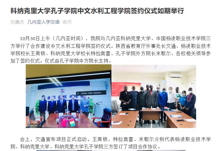 10月30日上午(几内亚时间),我院与几内亚科纳克里大学、中国杨凌职业技术学院三方举行了合作建设中文水利工程学院签约仪式。陕西省教育厅外事处长文通、杨凌职业技术学院校长王周锁、科纳克里大学校长特拉奥雷、孔子学院外方院长米歇尔、各校相关领导参加了签约仪式。仪式由孔子学院中方院长主持。