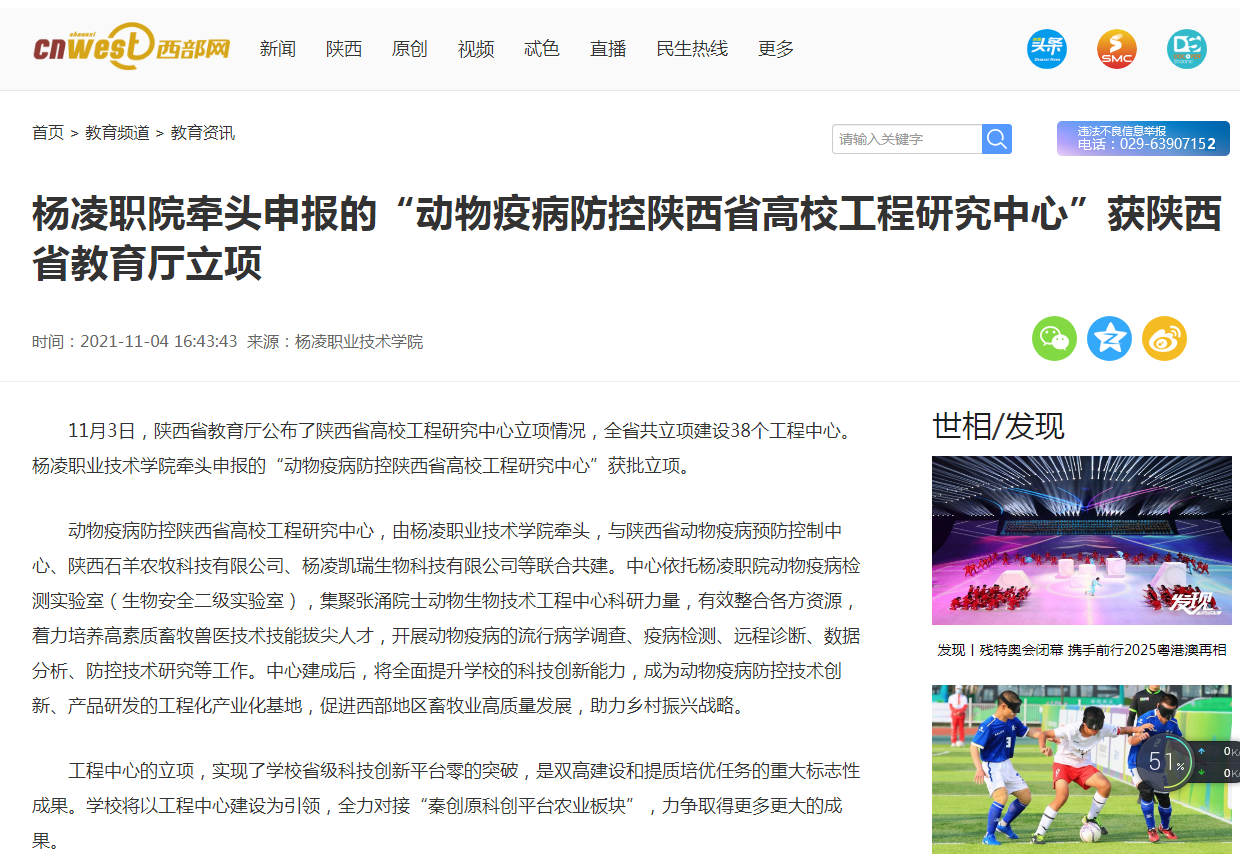 11月3日,陕西省教育厅公布了陕西省高校工程研究中心立项情况,全省共立项建设38个工程中心。杨凌职业技术学院牵头申报的“动物疫病防控陕西省高校工程研究中心”获批立项。