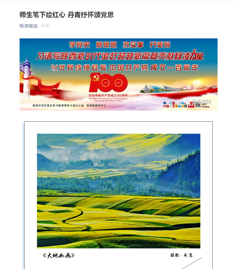 本次书画摄影展既是杨凌职业技术学院庆祝中国共产党成立100周年的一项重要活动,也是党史学习教育的一项重要工作。学院书画艺术中心主任李德君告诉记者:“这次师生书画摄影展,暨是对党百年华诞的献礼,也是学院艺术教育努力教学研究的成果汇报,充分展现了杨凌职业技术学院广大师生爱党、爱国的深厚情怀和昂扬向上的精神风貌。”