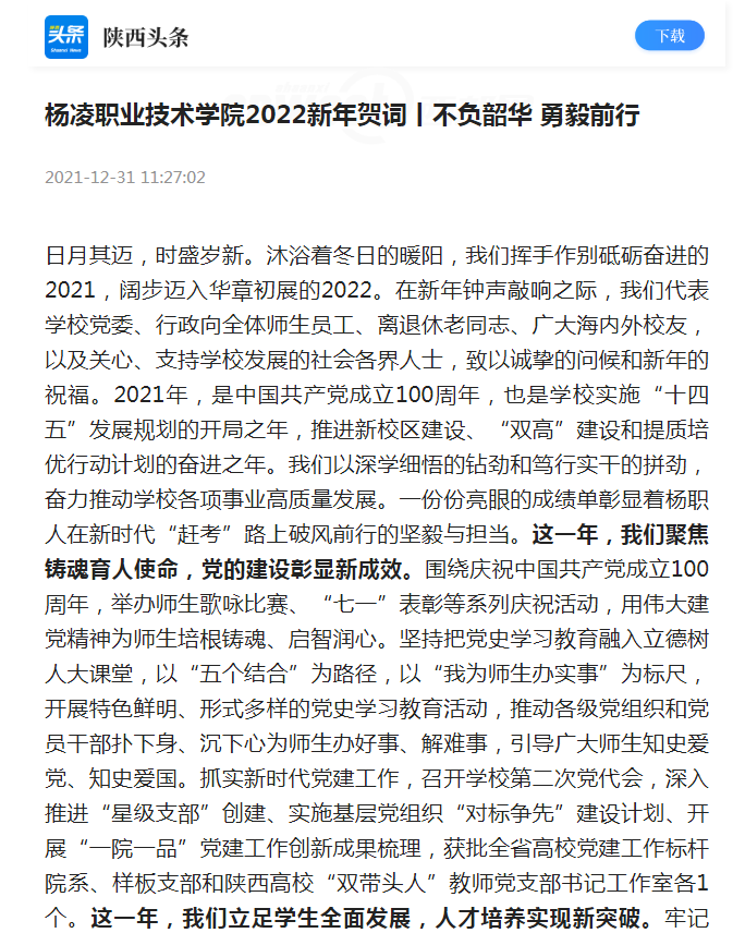 【陕西头条】杨凌职业技术学院2022新年贺词丨不负韶华 勇毅前行