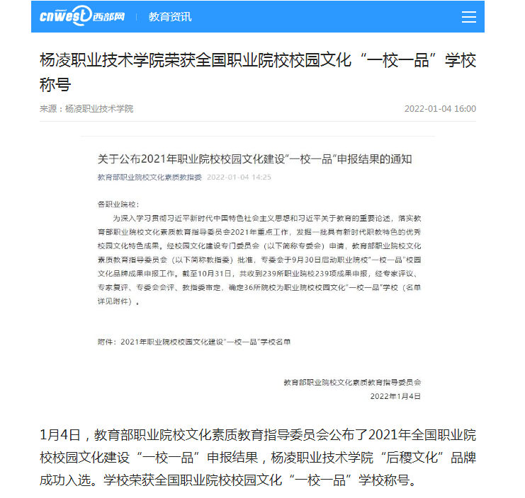【西部网】杨凌职业技术学院荣获全国职业院校校园文化“一校一品”学校称号