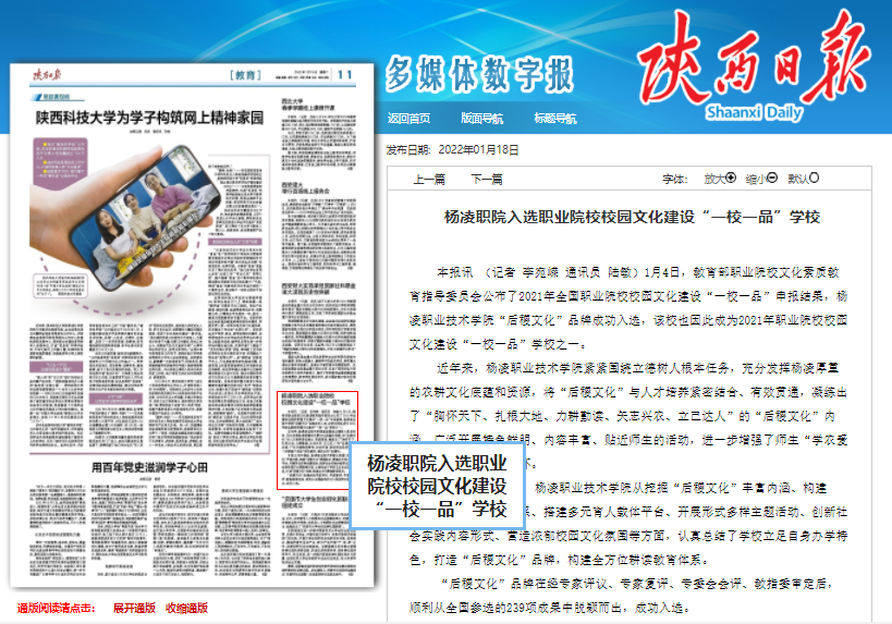 本报讯 (记者 李宛嵘 通讯员 陆敏)1月4日,教育部职业院校文化素质教育指导委员会公布了2021年全国职业院校校园文化建设“一校一品”申报结果,杨凌职业技术学院“后稷文化”品牌成功入选,该校也因此成为2021年职业院校校园文化建设“一校一品”学校之一。