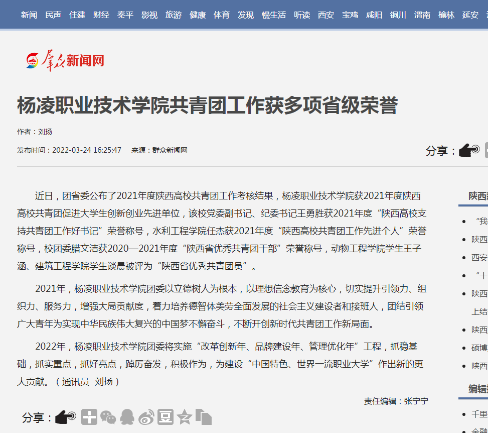 近日,团省委公布了2021年度陕西高校共青团工作考核结果,杨凌职业技术学院获2021年度陕西高校共青团促进大学生创新创业先进单位,该校党委副书记、纪委书记王勇胜获2021年度“陕西高校支持共青团工作好书记”荣誉称号,水利工程学院任杰获2021年度“陕西高校共青团工作先进个人”荣誉称号,校团委腊文洁获2020—2021年度“陕西省优秀共青团干部”荣誉称号,动物工程学院学生王子涵、建筑工程学院学生谈晨被评为“陕西省优秀共青团员”。
