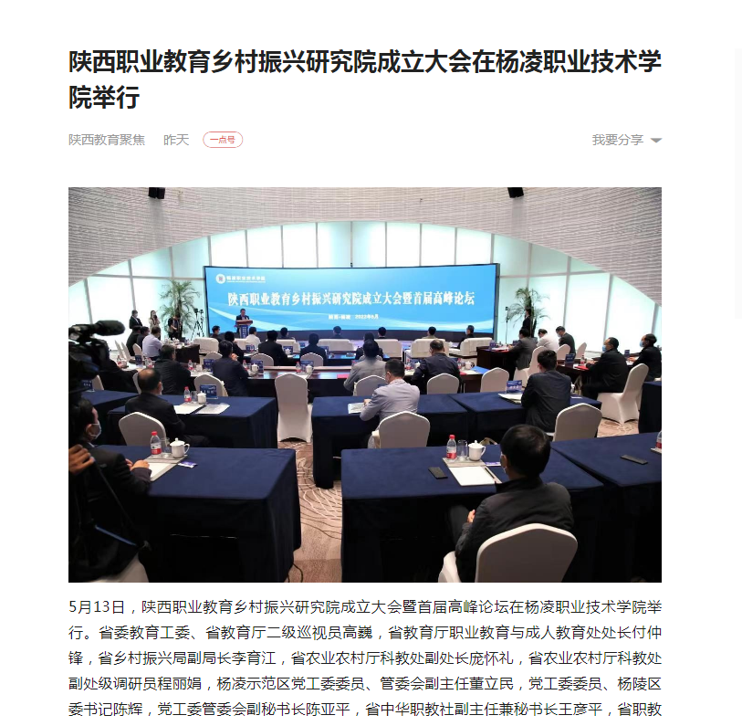 【一点资讯】陕西职业教育乡村振兴研究院成立大会在杨凌职业技术学院举行