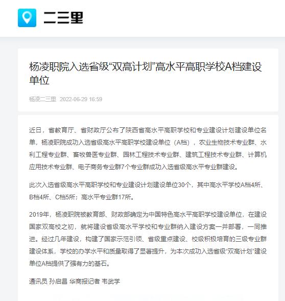 近日,省教育厅、省财政厅公布了陕西省高水平高职学校和专业建设计划建设单位名单,杨凌职业技术学院成功入选省级高水平高职学校建设单位(A档),农业生物技术专业群、水利工程专业群、畜牧兽医专业群、园林工程技术专业群、建筑工程技术专业群、计算机应用技术专业群、电子商务专业群7个专业群成功入选省级高水平专业群建设。