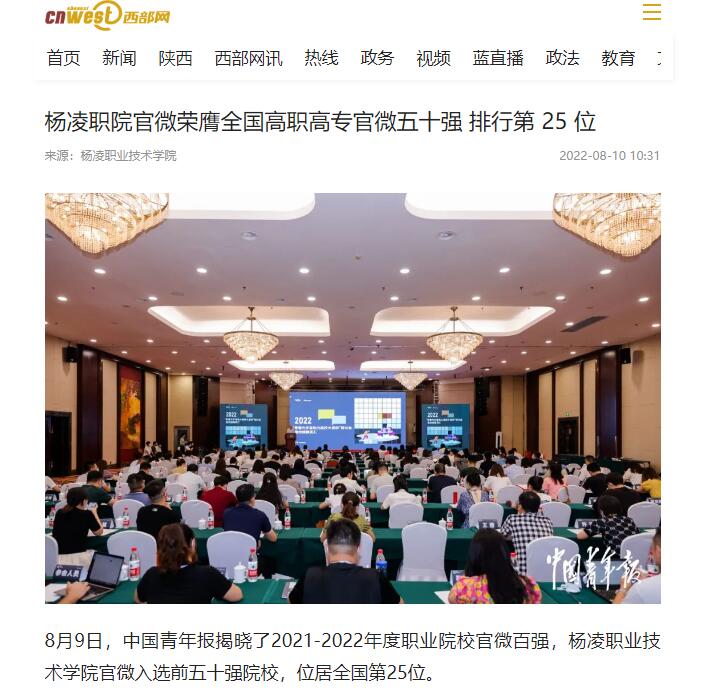 8月9日,中国青年报揭晓了2021-2022年度职业院校官微百强,杨凌职业技术学院官微入选前五十强院校,位居全国第25位。