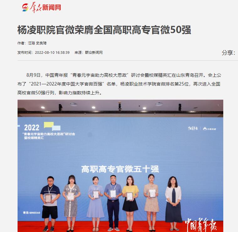 8月9日,中国青年报“青春元宇宙助力高校大思政”研讨会暨校媒精英汇在山东青岛召开。会上公布了“2021—2022年度中国大学官微百强”名单,杨凌职业技术学院官微排名第25位,再次进入全国高校官微50强行列,影响力指数持续上升。