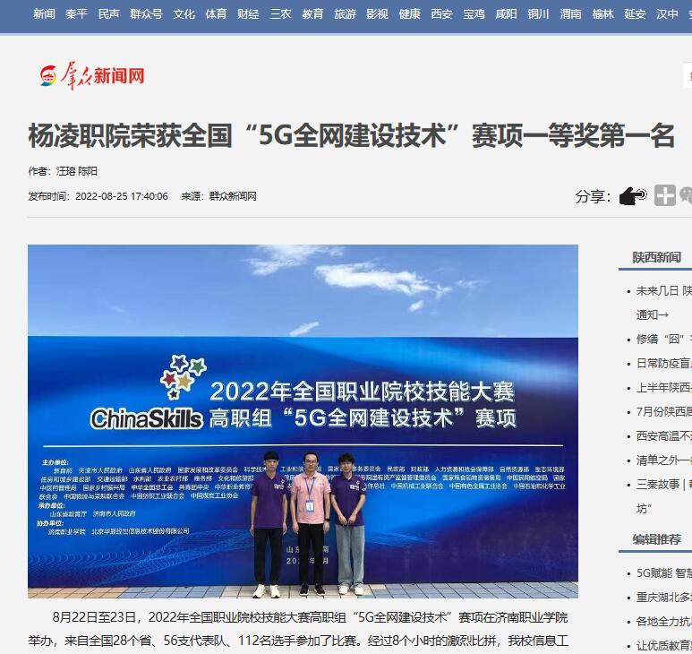 8月22日至23日,2022年全国职业院校技能大赛高职组“5G全网建设技术”赛项在济南职业学院举办,来自全国28个省、56支代表队、112名选手参加了比赛。经过8个小时的激烈比拼,我校信息工程学院学生郑嘉昊、曹文森以总分排名全国第一的成绩,荣获一等奖第一名,取得我校自参赛以来历史最好成绩,指导教师康晋、陈高锋荣获大赛优秀指导教师奖。