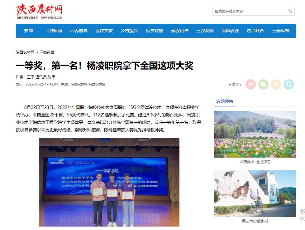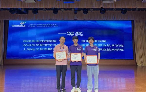 8月22日至23日,2022年全国职业院校技能大赛高职组“5G全网建设技术”赛项在济南职业学院举办,来自全国28个省、56支代表队、112名选手参加了比赛。经过8个小时的激烈比拼,杨凌职业技术学院信息工程学院学生郑嘉昊、曹文森以总分排名全国第一的成绩,荣获一等奖第一名,取得该校自参赛以来历史最好成绩,指导教师康晋、陈高锋荣获大赛优秀指导教师奖。