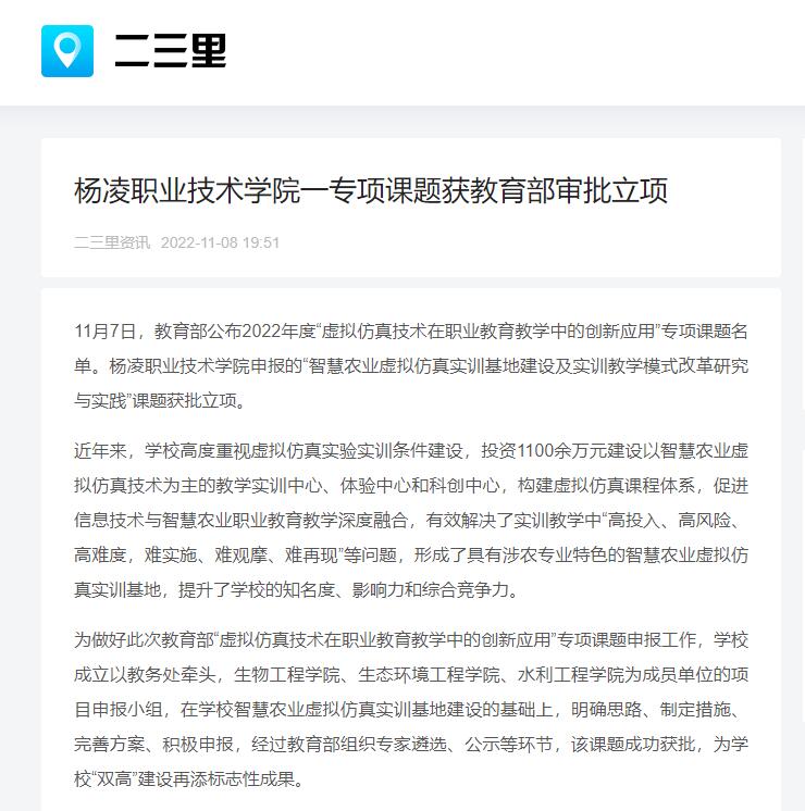 11月7日,教育部公布2022年度“虚拟仿真技术在职业教育教学中的创新应用”专项课题名单。杨凌职业技术学院申报的“智慧农业虚拟仿真实训基地建设及实训教学模式改革研究与实践”课题获批立项。