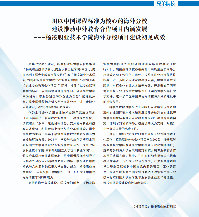 聚焦“双高”建设,杨凌职业技术学院积极推进“杨凌职业技术学院-几内亚水利工程学院(中国-几内亚水利工程专业教育合作项目)”和“杨凌职业技术学院-古利斯坦国立大学现代农业学院(中国-乌兹别克斯坦农业专业教育合作项目)”建设,按照“以专业课程教学为核心、以国际教育合作为平台、以分享教学成果为目标、以服务我国海外企业为任务”的建设原则,将中国课程标准引入两所海外分校,进一步深化内涵建设,海外分校建设初显成效。