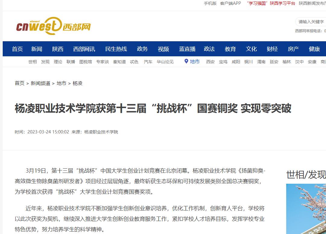 3月19日,第十三届“挑战杯”中国大学生创业计划竞赛在北京闭幕。杨凌职业技术学院《扬菌抑臭-高效微生物除臭菌剂研发者》项目经过层层角逐,最终斩获生态环保和可持续发展类别全国总决赛铜奖,为学校首次获得“挑战杯”大学生创业计划竞赛国赛奖项。