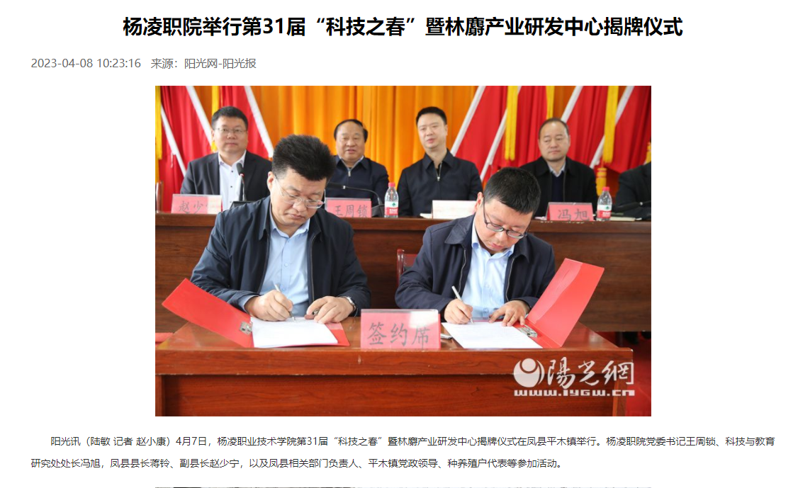 阳光讯(陆敏 记者 赵小康)4月7日,杨凌职业技术学院第31届“科技之春”暨林麝产业研发中心揭牌仪式在凤县平木镇举行。杨凌职院党委书记王周锁、科技与教育研究处处长冯旭,凤县县长蒋铃、副县长赵少宁,以及凤县相关部门负责人、平木镇党政领导、种养殖户代表等参加活动。