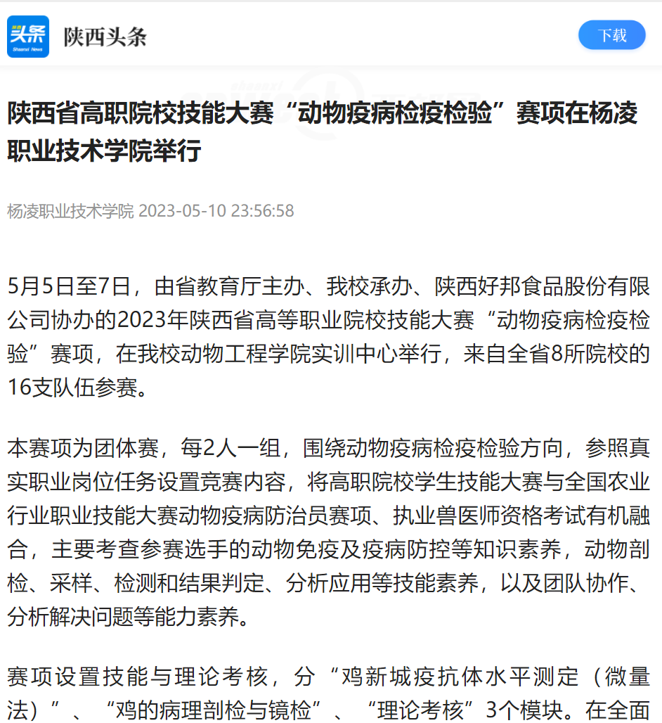 5月5日至7日,由省教育厅主办、我校承办、陕西好邦食品股份有限公司协办的2023年陕西省高等职业院校技能大赛“动物疫病检疫检验”赛项,在我校动物工程学院实训中心举行,来自全省8所院校的16支队伍参赛。