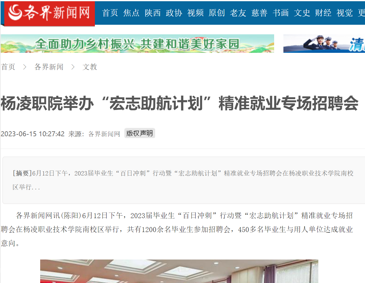 6月12日下午,2023届毕业生“百日冲刺”行动暨“宏志助航计划”精准就业专场招聘会在杨凌职业技术学院南校区举行,共有1200余名毕业生参加招聘会,450多名毕业生与用人单位达成就业意向。