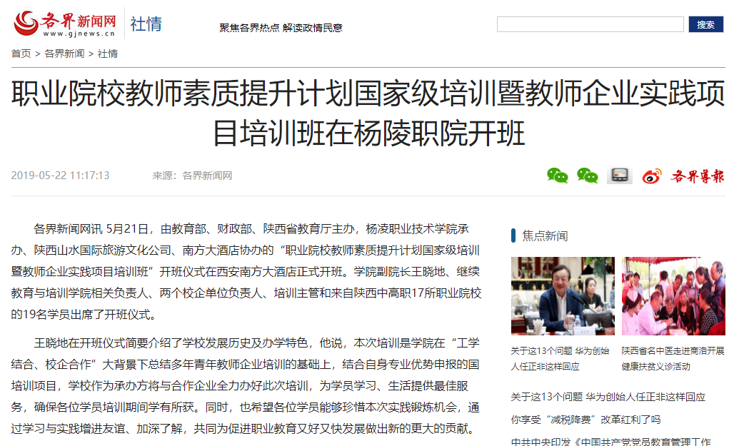 各界新闻网讯 5月21日,由教育部、财政部、陕西省教育厅主办,杨凌职业技术学院承办、陕西山水国际旅游文化公司、南方大酒店协办的“职业院校教师素质提升计划国家级培训暨教师企业实践项目培训班”开班仪式在西安南方大酒店正式开班。学院副院长王晓地、继续教育与培训学院相关负责人、两个校企单位负责人、培训主管和来自陕西中高职17所职业院校的19名学员出席了开班仪式。