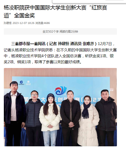 12月7日,记者从杨凌职业技术学院获悉:在不久前的中国国际大学生创新大赛中,杨凌职业技术学院4个团队进入全国总决赛,斩获金奖1项、银奖2项、铜奖1项,取得了参赛以来的最好成绩。