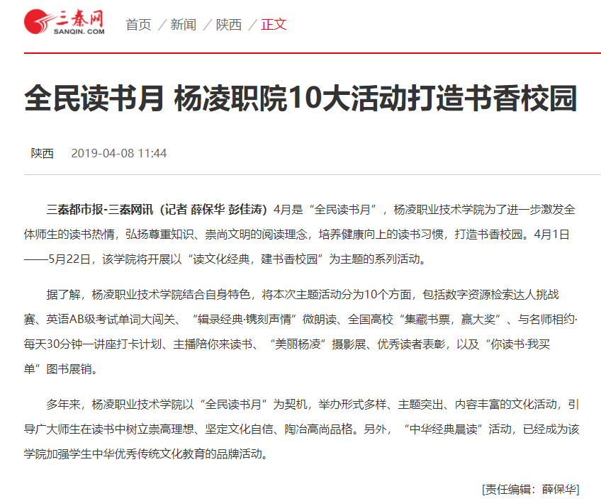 三秦都市报-三秦网讯(记者 薛保华 彭佳涛)4月是“全民读书月”,杨凌职业技术学院为了进一步激发全体师生的读书热情,弘扬尊重知识、崇尚文明的阅读理念,培养健康向上的读书习惯,打造书香校园。4月1日——5月22日,该学院将开展以“读文化经典,建书香校园”为主题的系列活动。