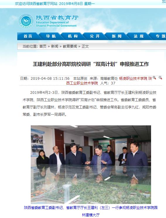 2019年4月2-3日,陕西省委教育工委副书记、省教育厅厅长王建利到杨凌职业技术学院、陕西工业职业技术学院调研“双高计划”申报推进工作。省委教育工委委员、省教育厅副厅长刘建林,杨凌示范区党工委副书记、管委会常务副主任李九红,咸阳市委常委、副市长罗军一同调研。