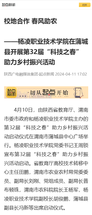 4月10日,由陕西省教育厅、渭南市委市政府和杨凌职业技术学院主办的第32届“科技之春”助力乡村振兴活动启动仪式在渭南市蒲城县中心广场举行。杨凌职业技术学院党委书记王周锁宣布第32届“科技之春”助力乡村振兴活动启动。省教育厅高校技术转移中心主任田鹏,渭南市农业农村局党委委员、副局长刘刚、党组成员、副局长普布顿珠,渭南市农科院院长王杨军,杨凌职业技术学院副校长胡俊鹏,蒲城县副县长冯新等出席启动仪式。