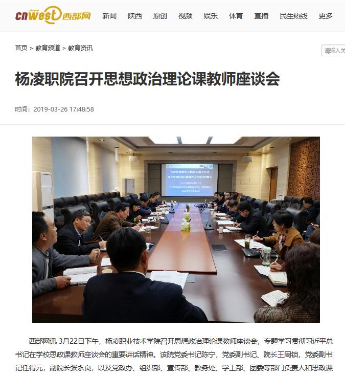 3月22日下午,杨凌职业技术学院召开思想政治理论课教师座谈会,专题学习贯彻习近平总书记在学校思政课教师座谈会的重要讲话精神。该院党委书记陈宁,党委副书记、院长王周锁,党委副书记任得元,副院长张永良,以及党政办、组织部、宣传部、教务处、学工部、团委等部门负责人和思政课教学部全体教师参加了会议。会议由任得元主持。
