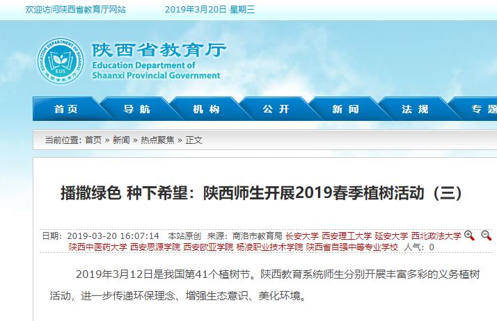 2019年3月12日是我国第41个植树节。陕西教育系统师生分别开展丰富多彩的义务植树活动,进一步传递环保理念、增强生态意识、美化环境。