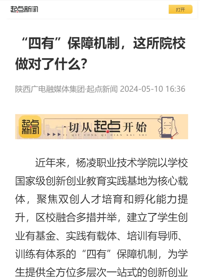 近年来,杨凌职业技术学院以学校国家级创新创业教育实践基地为核心载体,聚焦双创人才培育和孵化能力提升,区校融合多措并举,建立了学生创业有基金、实践有载体、培训有导师、训练有体系的“四有”保障机制,为学生提供全方位多层次一站式的创新创业服务,着力培养懂农业、爱农村、爱农民“一懂两爱”的乡村振兴创新型人才,成效明显。