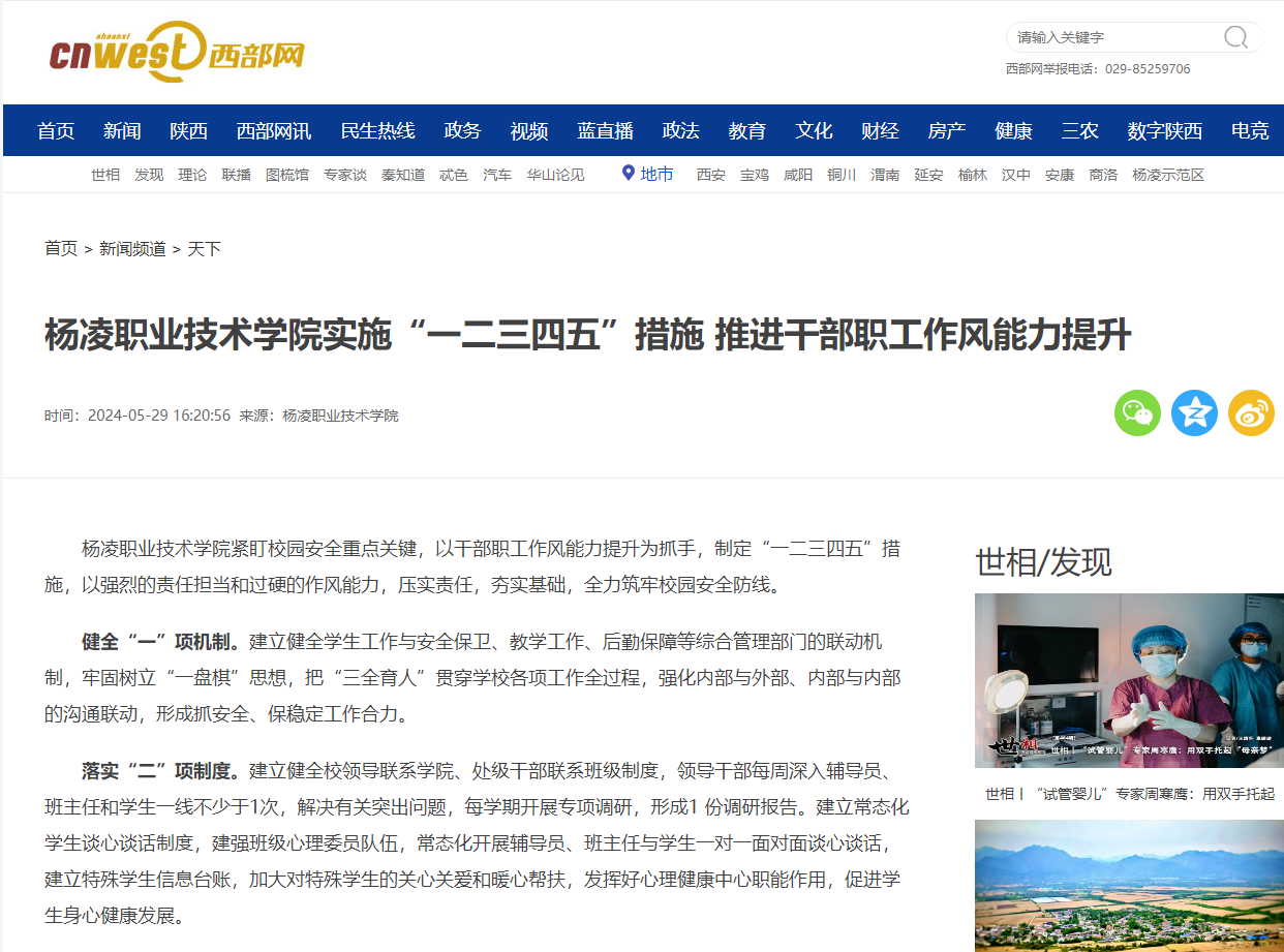 “一二三四五”措施是杨凌职业技术学院持续落实全省“三个年”活动,进一步深化干部作风能力建设、强化学生教育管理、提高育人质效的一项重要举措。该措施自本学期实施以来,全体校领导、处级干部能够积极发挥在学生教育管理中的带动作用,下沉一线主动联系师生、解决问题;辅导员每天上午7:50-8:30在学生公寓开展工作,班主任每周深入学生公寓2次以上,辅导员、班主任与学生谈心谈话1.4万余人次,形成了辅导员和班主任自觉入住学生公寓、全面了解学生生活情况和心理状况的常态化机制;广大学生能够牢严格遵守校规校纪,养成良好的行为习惯,提高自我约束能力,打造了清净的校风、清正的教风、清新的学风,更筑起了校园安全防线。