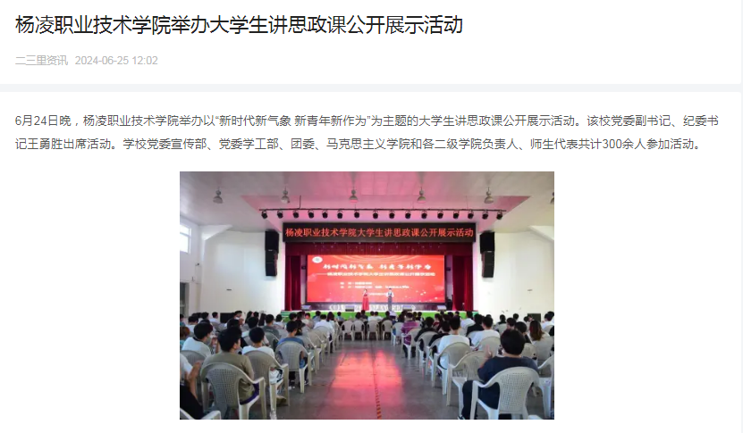 6月24日晚,杨凌职业技术学院举办以“新时代新气象 新青年新作为”为主题的大学生讲思政课公开展示活动。校党委副书记、纪委书记王勇胜出席活动。学校党委宣传部、党委学工部、团委、马克思主义学院和各二级学院负责人、师生代表共计300余人参加活动。