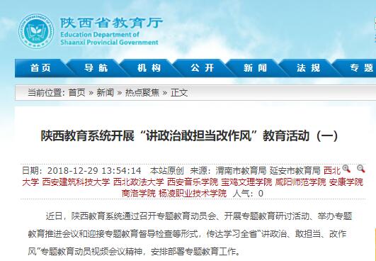 近日,陕西教育系统通过召开专题教育动员会、开展专题教育研讨活动、举办专题教育推进会议和迎接专题教育督导检查等形式,传达学习全省“讲政治、敢担当、改作风”专题教育动员视频会议精神,安排部署专题教育工作。