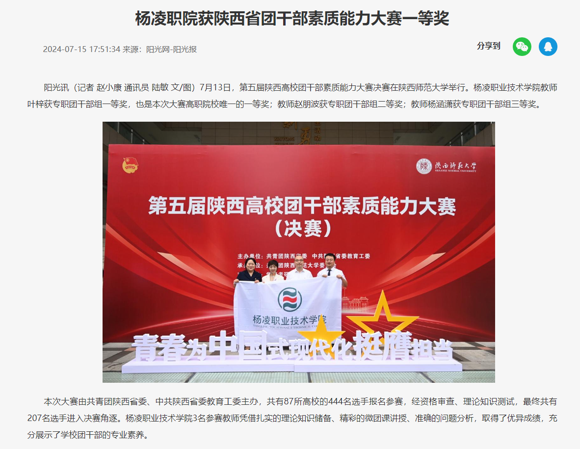 阳光讯(记者 赵小康 通讯员 陆敏 文/图)7月13日,第五届陕西高校团干部素质能力大赛决赛在陕西师范大学举行。杨凌职业技术学院教师叶梓获专职团干部组一等奖,也是本次大赛高职院校唯一的一等奖;教师赵朋波获专职团干部组二等奖;教师杨涵潇获专职团干部组三等奖。