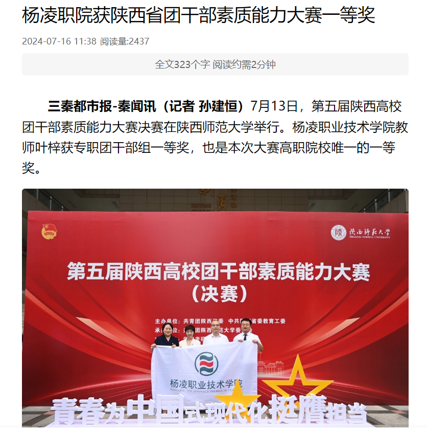 三秦都市报-秦闻讯(记者 孙建恒)7月13日,第五届陕西高校团干部素质能力大赛决赛在陕西师范大学举行。杨凌职业技术学院教师叶梓获专职团干部组一等奖,也是本次大赛高职院校唯一的一等奖。