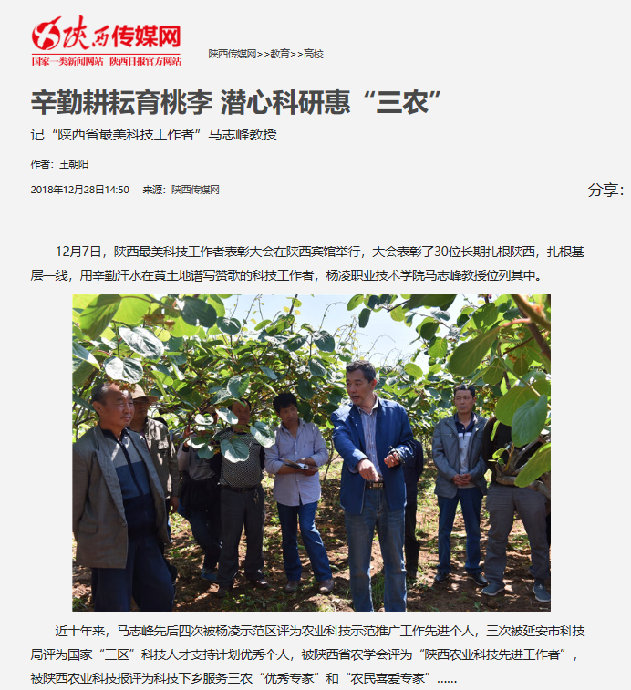 12月7日,陕西最美科技工作者表彰大会在陕西宾馆举行,大会表彰了30位长期扎根陕西,扎根基层一线,用辛勤汗水在黄土地谱写赞歌的科技工作者,杨凌职业技术学院马志峰教授位列其中。