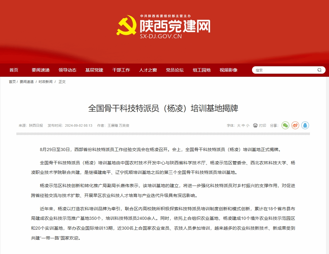 全国骨干科技特派员(杨凌)培训基地由中国农村技术开发中心与陕西省科学技术厅、杨凌示范区管委会、西北农林科技大学、杨凌职业技术学院联合共建,是继福建南平、辽宁抚顺培训基地之后的第三个全国骨干科技特派员培训基地。