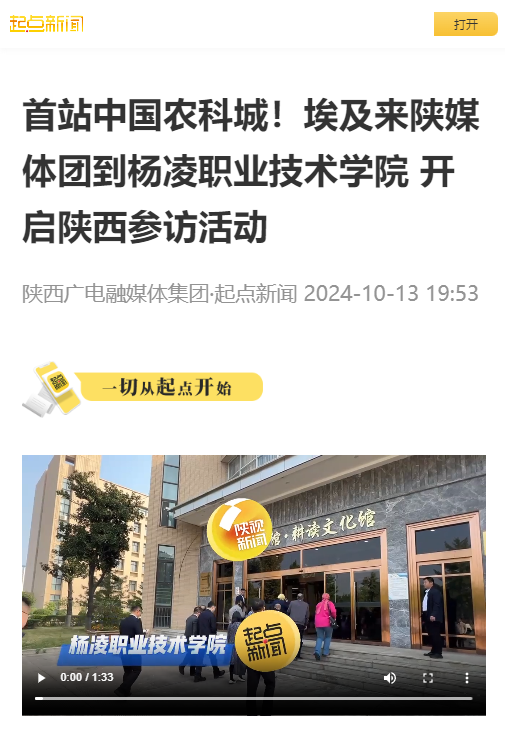 10月13日至15日,埃及媒体团来陕参访。10月13日上午,团组首站来到杨凌职业技术学院,看校史、了解农业学科建设、参观水工大厅。埃及媒体记者表示,在这里不仅了解了中国在农业教育方面的发展成就,同时也为中埃两国在农业、水利等方面进一步合作搭建了桥梁。