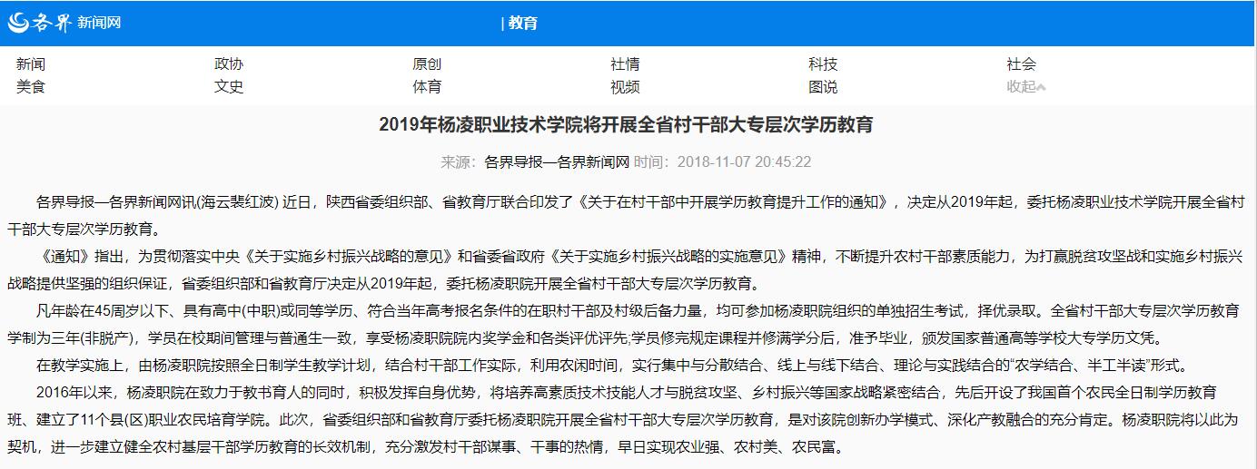 各界导报—各界新闻网讯(海云裴红波) 近日,陕西省委组织部、省教育厅联合印发了《关于在村干部中开展学历教育提升工作的通知》,决定从2019年起,委托杨凌职业技术学院开展全省村干部大专层次学历教育。