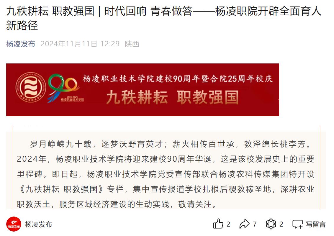 在构建思政教育新格局中,杨凌职院将耕读教育作为落实“立德树人”根本任务的重要抓手,深入开展“后稷文化”品牌创建活动,形成了课程体系夯基、载体平台促学、文化活动赋能、社会实践深化、校园环境浸润的“后稷文化”育人体系。