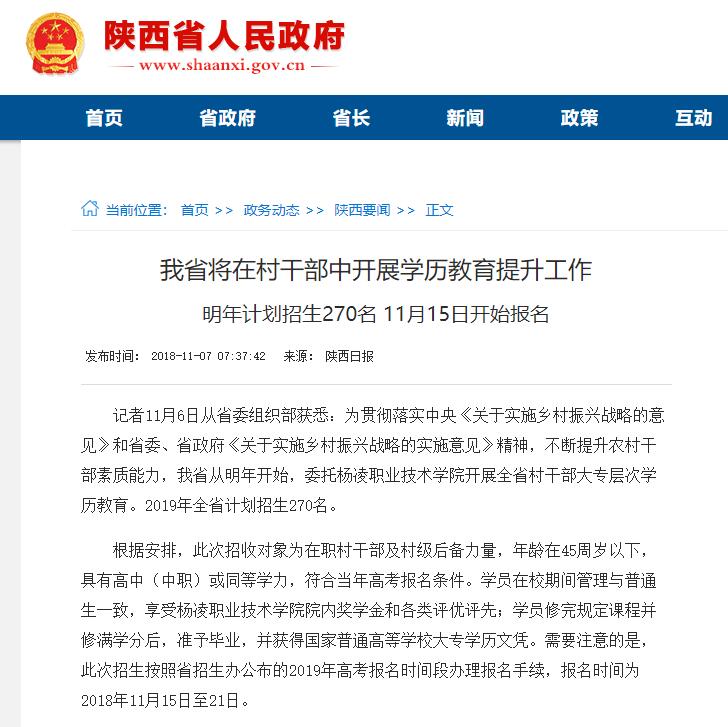 记者11月6日从省委组织部获悉:为贯彻落实中央《关于实施乡村振兴战略的意见》和省委、省政府《关于实施乡村振兴战略的实施意见》精神,不断提升农村干部素质能力,我省从明年开始,委托杨凌职业技术学院开展全省村干部大专层次学历教育。2019年全省计划招生270名。