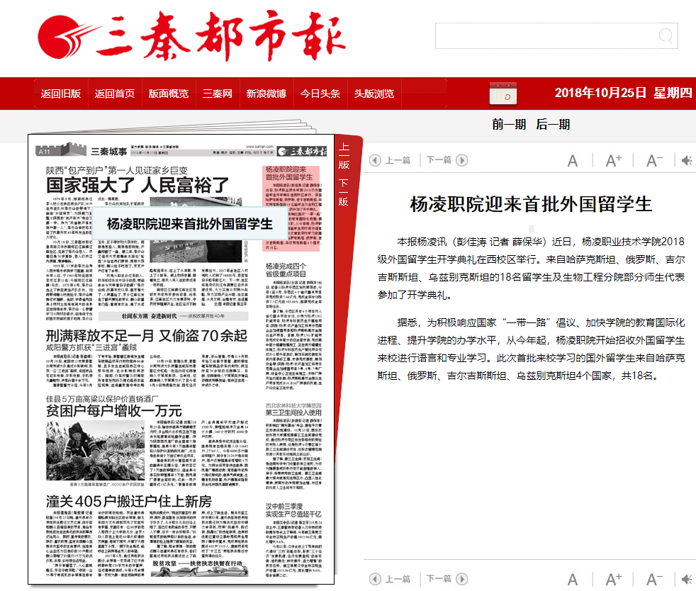 本报杨凌讯(彭佳涛 记者 薛保华)近日,杨凌职业技术学院2018级外国留学生开学典礼在西校区举行。来自哈萨克斯坦、俄罗斯、吉尔吉斯斯坦、乌兹别克斯坦的18名留学生及生物工程分院部分师生代表参加了开学典礼。