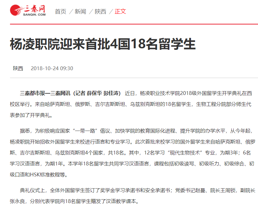 据悉,为积极响应国家“一带一路”倡议、加快学院的教育国际化进程、提升学院的办学水平,从今年起,杨凌职院开始招收外国留学生来校进行语言和专业学习。此次首批来校学习的国外留学生来自哈萨克斯坦、俄罗斯、吉尔吉斯斯坦、乌兹别克斯坦4个国家,共18名。其中,12名学习“现代生物技术”专业,为期3年;6名学习汉语语言,为期1年。本学年18名留学生共同学习汉语语言,课程包括初级读写、初级听力、初级综合、初级口语和HSK标准教程等。