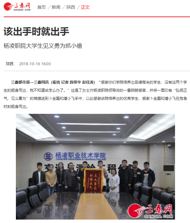 三秦都市报—三秦网讯(崔晓 记者 薛保华 彭佳涛)“感谢你们学院培养出品德高尚的学生,没有这两个学生的挺身而出,我不知道该怎么办了。”这是丁女士对杨凌职院领导说的一番肺腑感言,并将一面印有“弘扬正气、见义勇为”的锦旗送到卜金磊和潘小飞手中,以此感谢该院培养出的优秀学生,感谢卜金磊和潘小飞在危急时刻挺身而出。