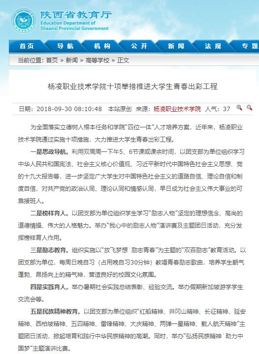 为全面落实立德树人根本任务和学院“四位一体”人才培养方案,近年来,杨凌职业技术学院通过实施十项措施,大力推进大学生青春出彩工程。