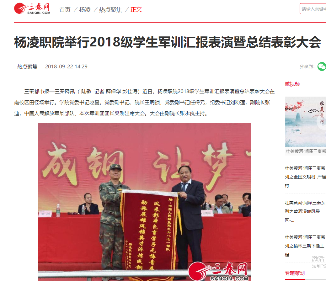 三秦都市报—三秦网讯( 陆敏 记者 薛保华 彭佳涛)近日,杨凌职院2018级学生军训汇报表演暨总结表彰大会在南校区田径场举行。学院党委书记赵曼,党委副书记、院长王周锁,党委副书记任得元,纪委书记刘粉莲,副院长张迪,中国人民解放军某部队、本次军训团团长樊刚出席大会。大会由副院长张永良主持。