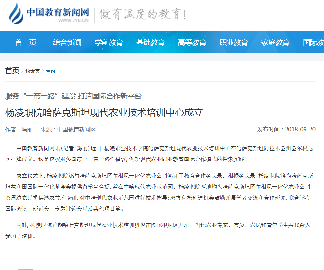 中国教育新闻网讯(记者 冯丽)近日,杨凌职业技术学院哈萨克斯坦现代农业技术培训中心在哈萨克斯坦阿拉木图州图尔根尼区挂牌成立。这是该校服务国家“一带一路”倡议,创新现代农业职业教育国际合作模式的探索实践。