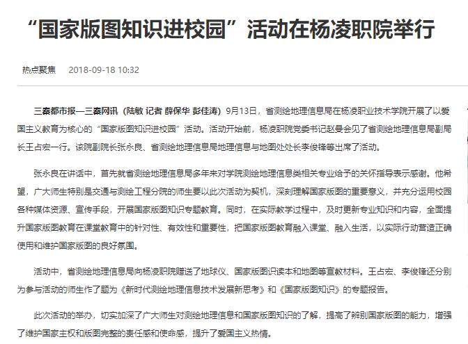 三秦都市报—三秦网讯(陆敏 记者 薛保华 彭佳涛)9月13日,省测绘地理信息局在杨凌职业技术学院开展了以爱国主义教育为核心的“国家版图知识进校园”活动。活动开始前,杨凌职院党委书记赵曼会见了省测绘地理信息局副局长王占宏一行。该院副院长张永良、省测绘地理信息局地理信息与地图处处长李俊锋等出席了活动。