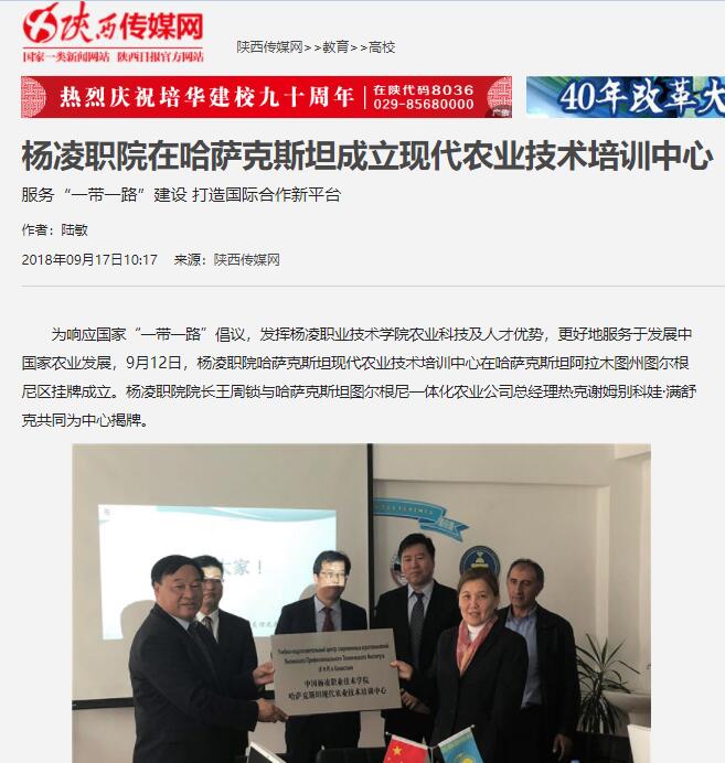 为响应国家“一带一路”倡议,发挥杨凌职业技术学院农业科技及人才优势,更好地服务于发展中国家农业发展,9月12日,杨凌职院哈萨克斯坦现代农业技术培训中心在哈萨克斯坦阿拉木图州图尔根尼区挂牌成立。杨凌职院院长王周锁与哈萨克斯坦图尔根尼一体化农业公司总经理热克谢姆别科娃·满舒克共同为中心揭牌。